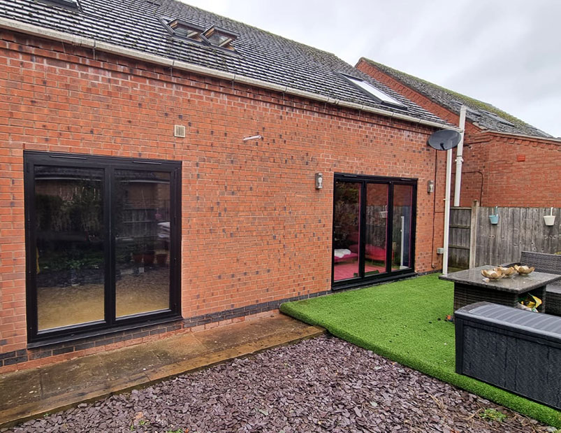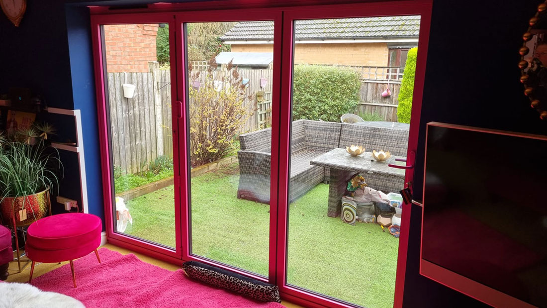 Here’s a few images from a recently completed installation of pink/black aluminium bi-fold doors. From the outside, the door frames are a contemporary black colour. Inside however, the choice of pink makes a strong but considered statement, working confidently with the darker wall tones and bright furnishings.